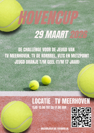 Ben jij erbij?!Op zondag 29 maart barst de strijd weer los bij TV Meerhoven! De jeugd van VLTC, de Korrel, TV Meerhoven en Metzpoint gaan knallen voor de HovenCup. Wie pakt dit jaar de grote beker… en natuurlijk de eeuwige roem? Maar boven alles: het wordt een supergezellige, sportieve middag vol tennis!
